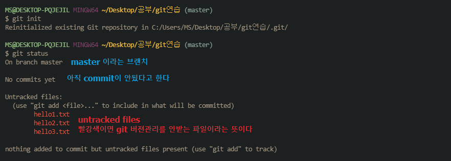 Untrackted files라고 뜨는데, 아직 깃이 이 파일들을 관리하고 있지 않다는 의미가 된다.