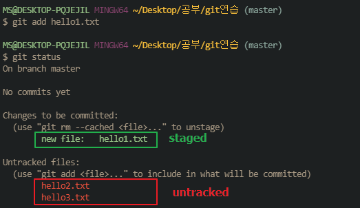 초록색 staged라는 말은 commit할수있는 상태 즉 스테이징 된 파일을 뜻한다.