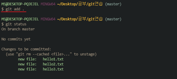 # git add명령어로 커밋할(깃에 반영할) 내용들을 추가할 수 있으며 이를 스테이징 이라고 한다