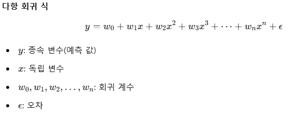 - 독립변수의 다항식 항을 포함하여 데이터를 적합시키기 때문에,