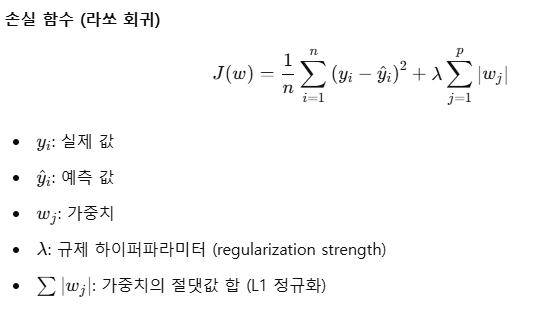 - 라쏘회귀는 L1 정규화를 사용하여, 모델의 가중치 중 일부를 0으로 만드는 특성이 있음