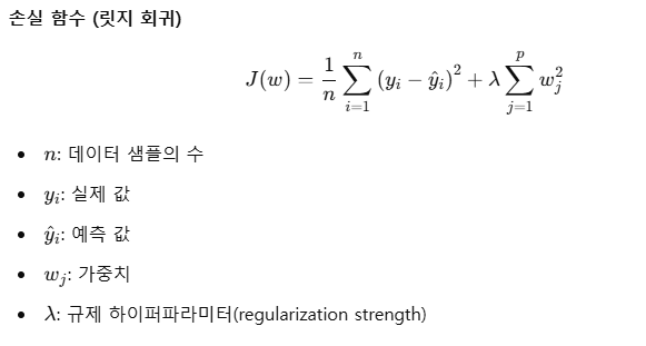 - 릿지회귀는 선형회귀의 손실 함수에 L2 정규화 항을 추가함
