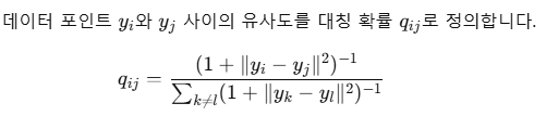 - 여기서 t-분포를 사용하여 거리 계산의 민감도를 줄입니다.