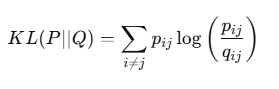 - 유사도 분포 P와 의 차이를 줄이기 위해 저차원 임베딩을 점진적으로 최적화합니다.
