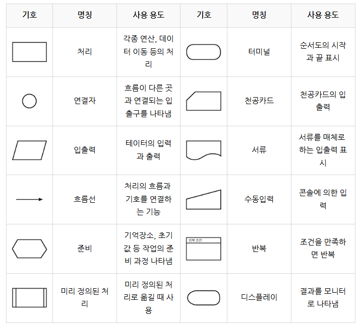 그 로직을 명확히 하기위해 통일된 기호와 도형을 사용하여 표시한다.