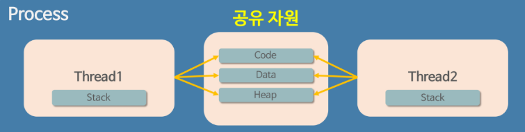 스레드는 프로세스가 할당 받은 자원을 이용하는 실행의 단위로서, 스레드끼리 프로세스의 자원을 공유하면서 프로세스 실행 흐름의 일부가 되기 때문에 동시 작업이 가능하다.