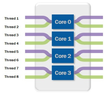 이 경우 물리적 코어 하나가 스레드 두 개 이상을 동시에 실행 가능하다는 의미가 된다.