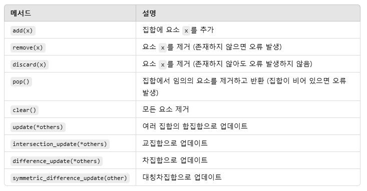 | 상위집합 | issuperset() | 현재 집합이 다른 집합의 상위집합인지 확인 |
