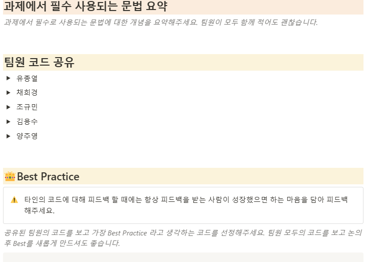 노션에 기록하며 팀원들과 의견교류를 하였고 다른사람들은 어떻게 풀이했을까? 란 의문을 가지며 서로 대놓고 염탐도 하면서 내가모르는 문법과 지식들을 습득했다.