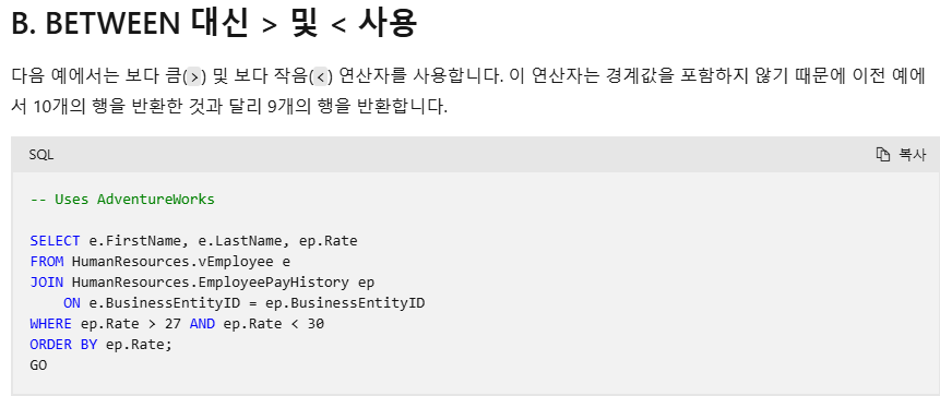 범위 지정을 위해 BETWEEN 이 아닌 비교연산자 2개를 사용한 예제가 있었다.